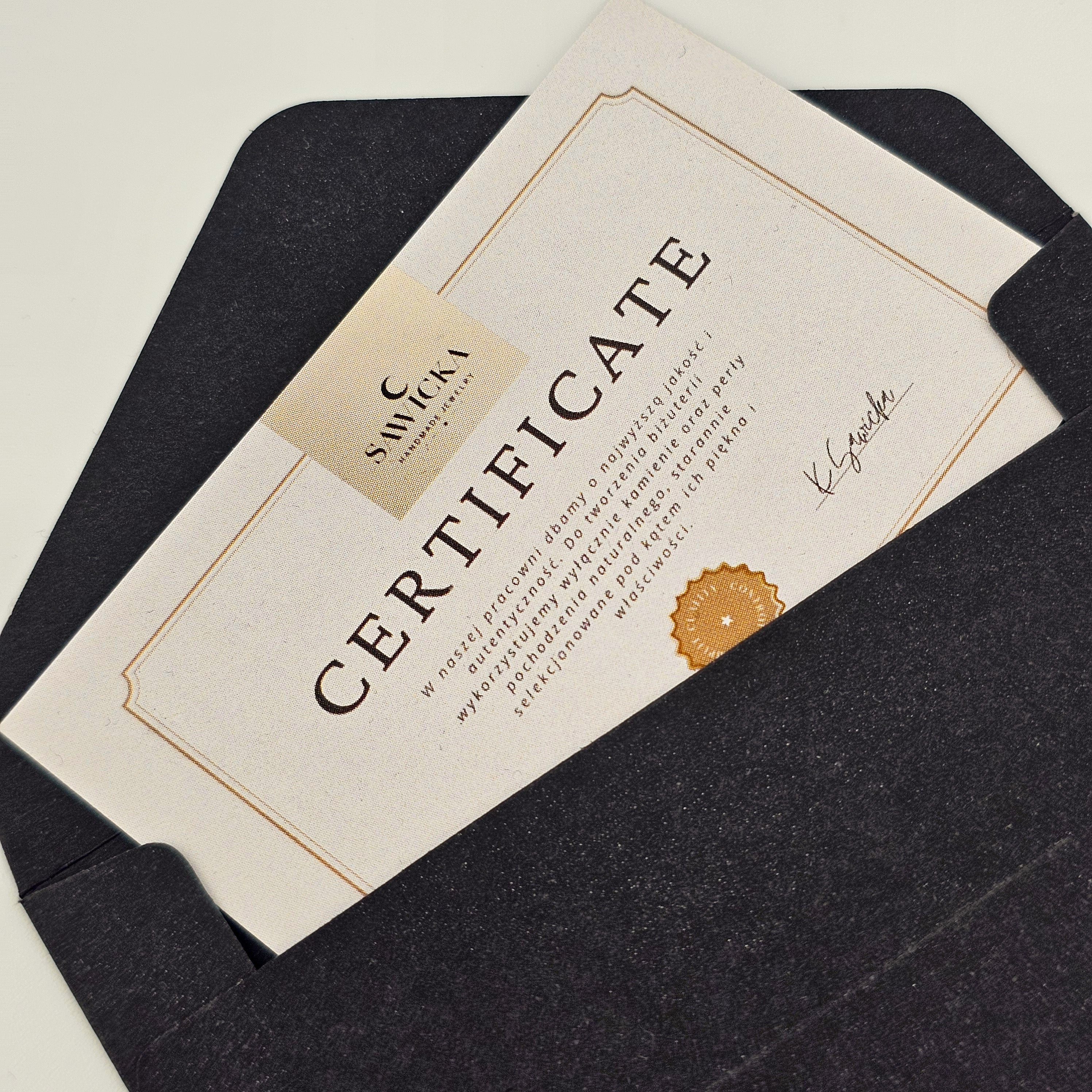 Certyfikat autentyczności kamieni i pereł dołączony do każdej biżuterii.