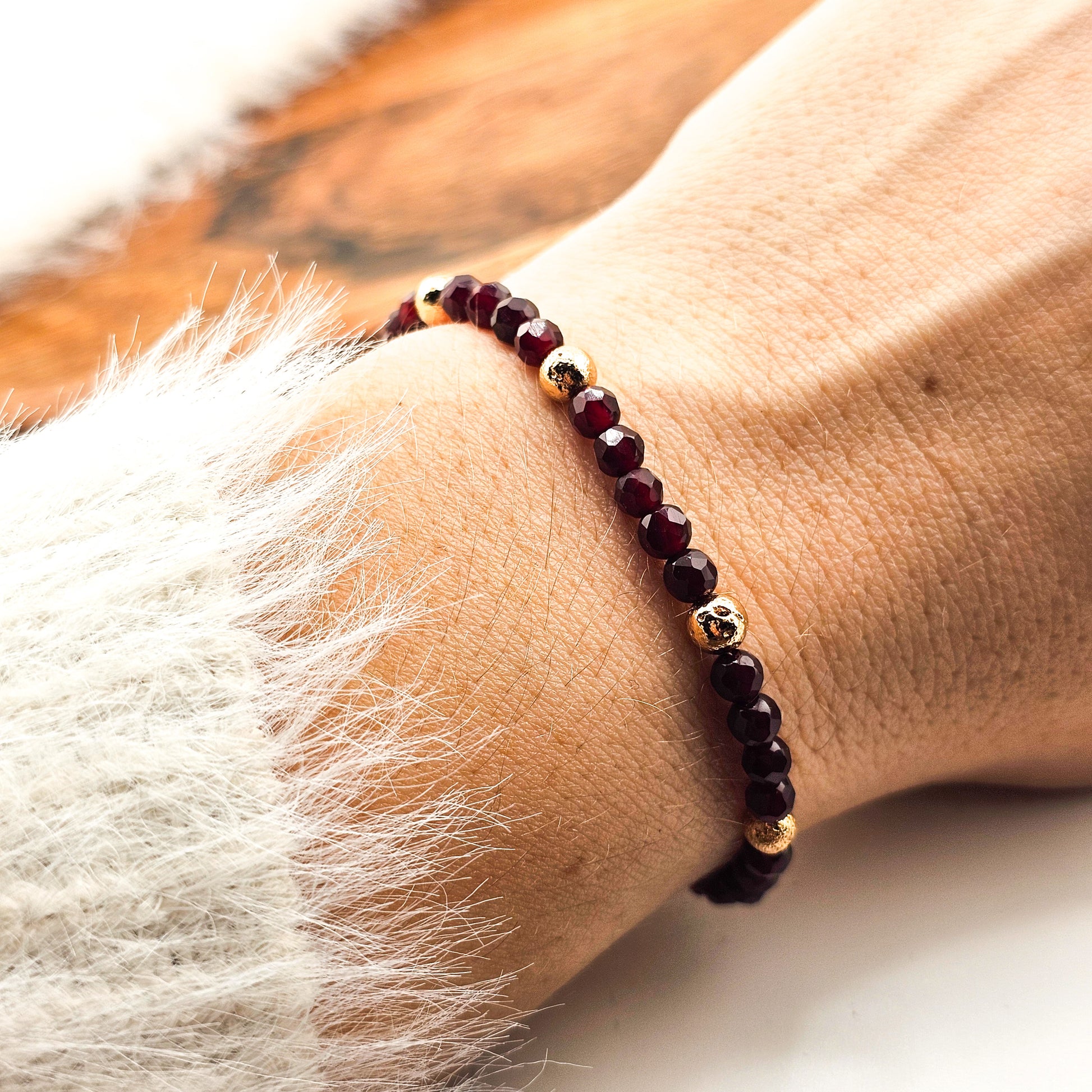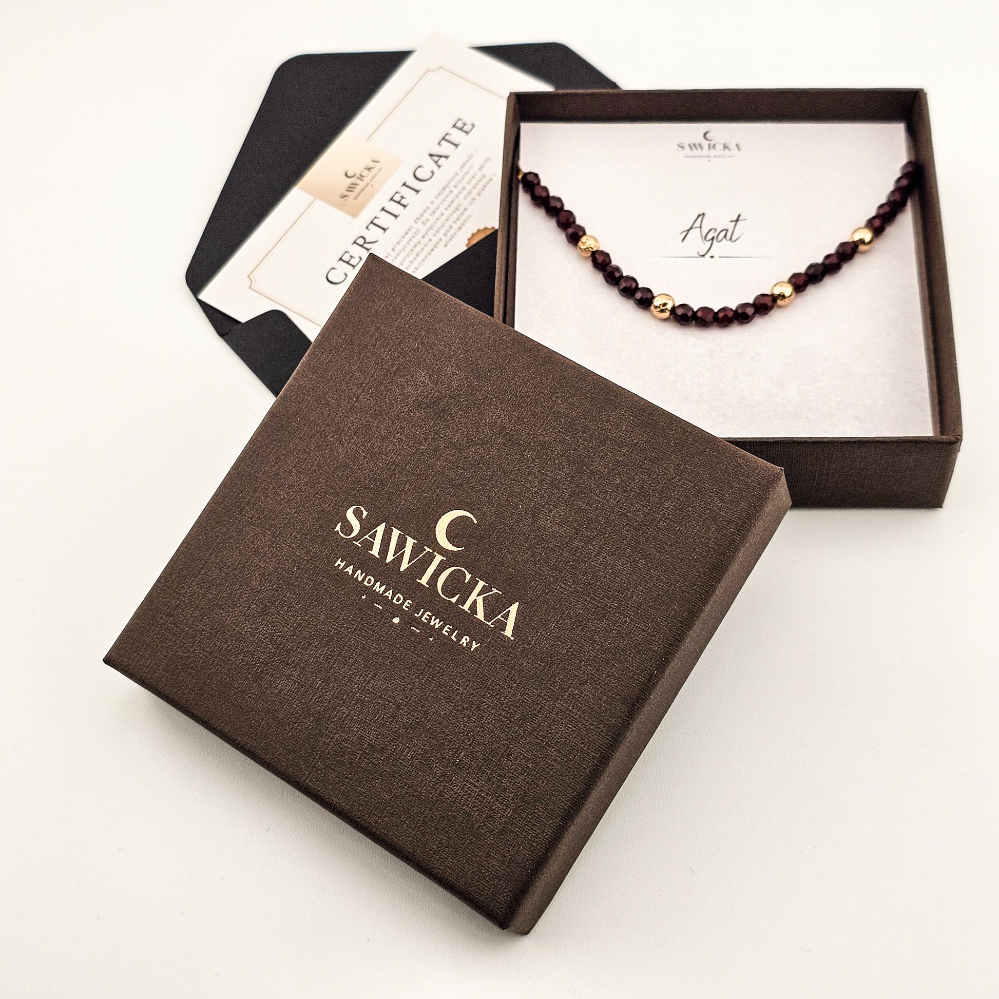 Bransoletka wykonana z kamieni naturalnych, na jedwabnej nici oraz koralików/elementów ze srebra próby 925 pozłacanych 24kt złotem.