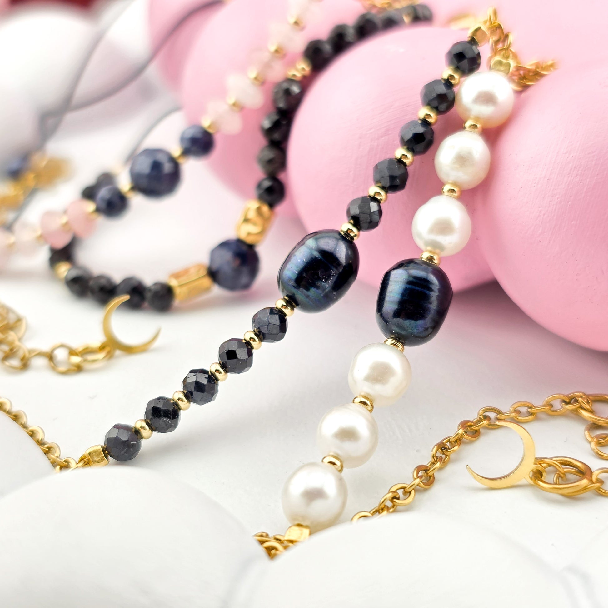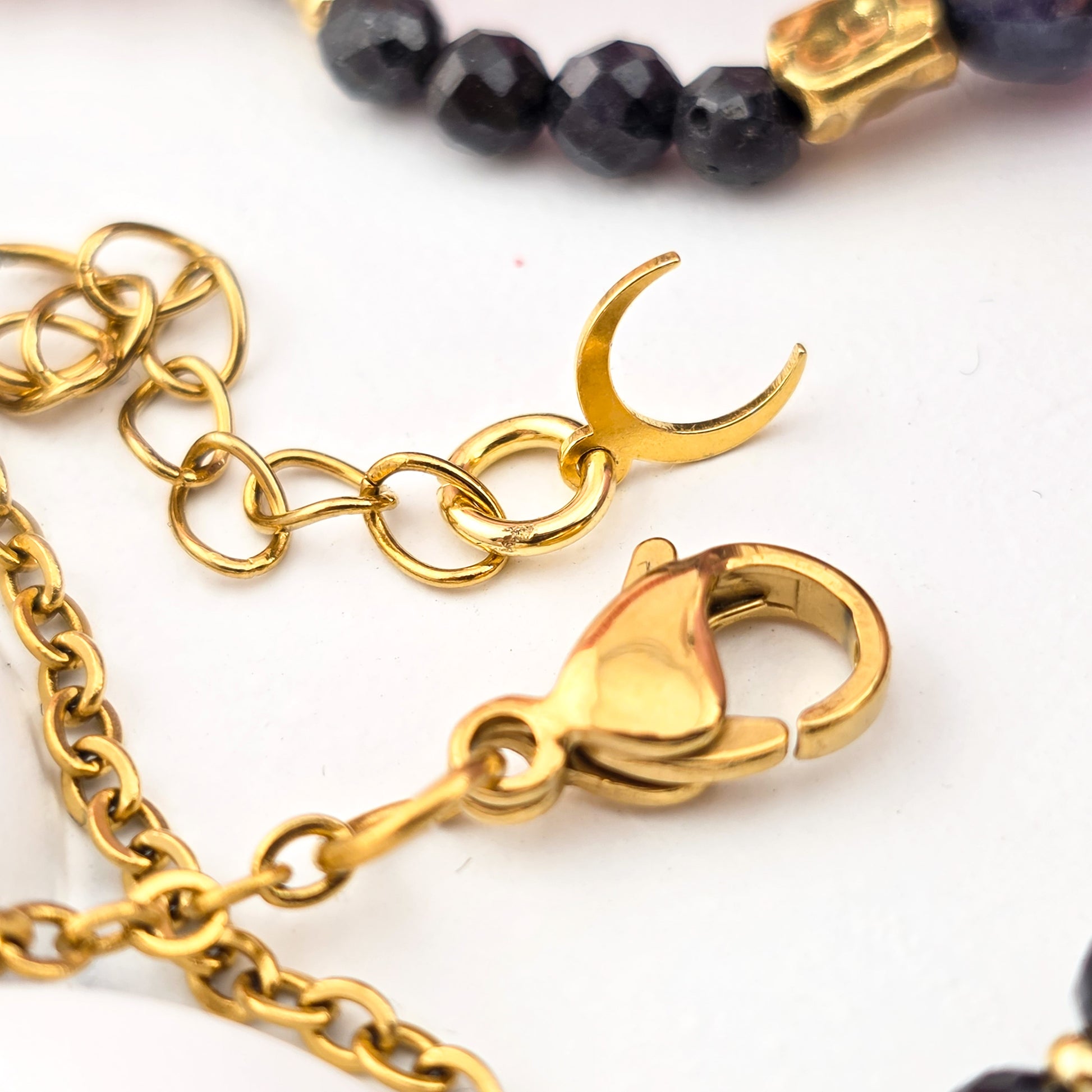 Bransoletka wykonana z kamieni naturalnych, koralików/elementów ze srebra próby 925 pozłacanych 24kt złotem oraz stali chirurgicznej / szlachetnej pozłacanej (IP)