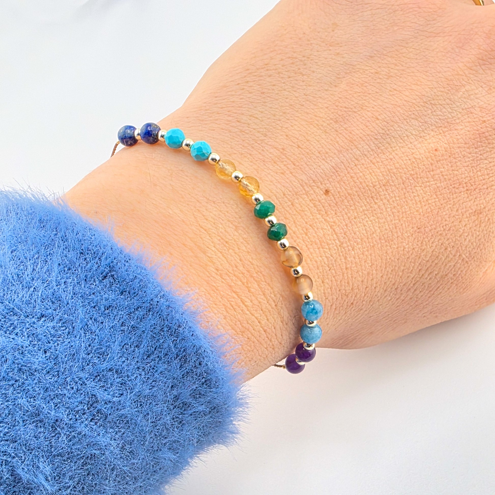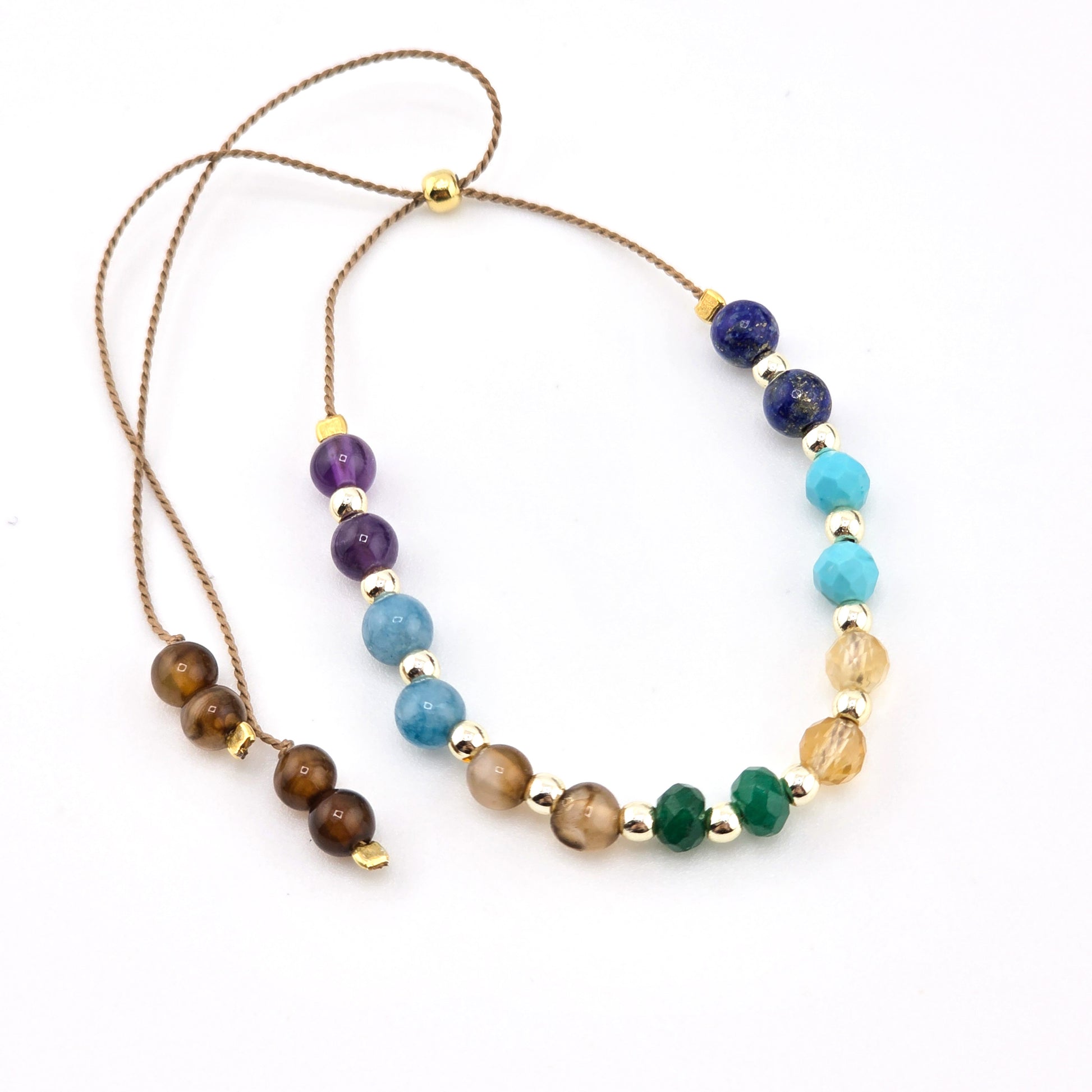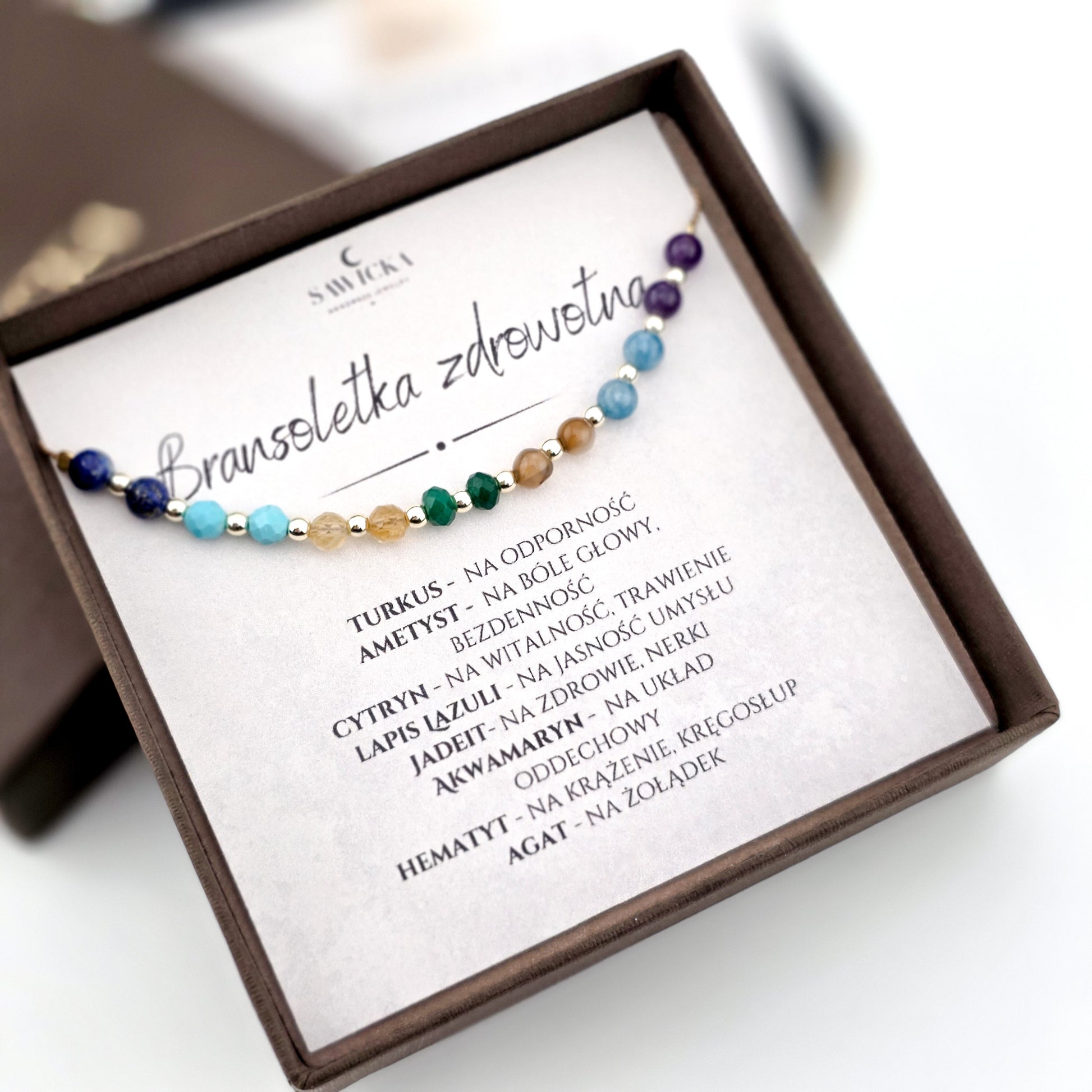 Bransoletka wykonana z kamieni naturalnych, na jedwabnej nici oraz koralików/elementów ze srebra próby 925 pozłacanych 24kt złotem.