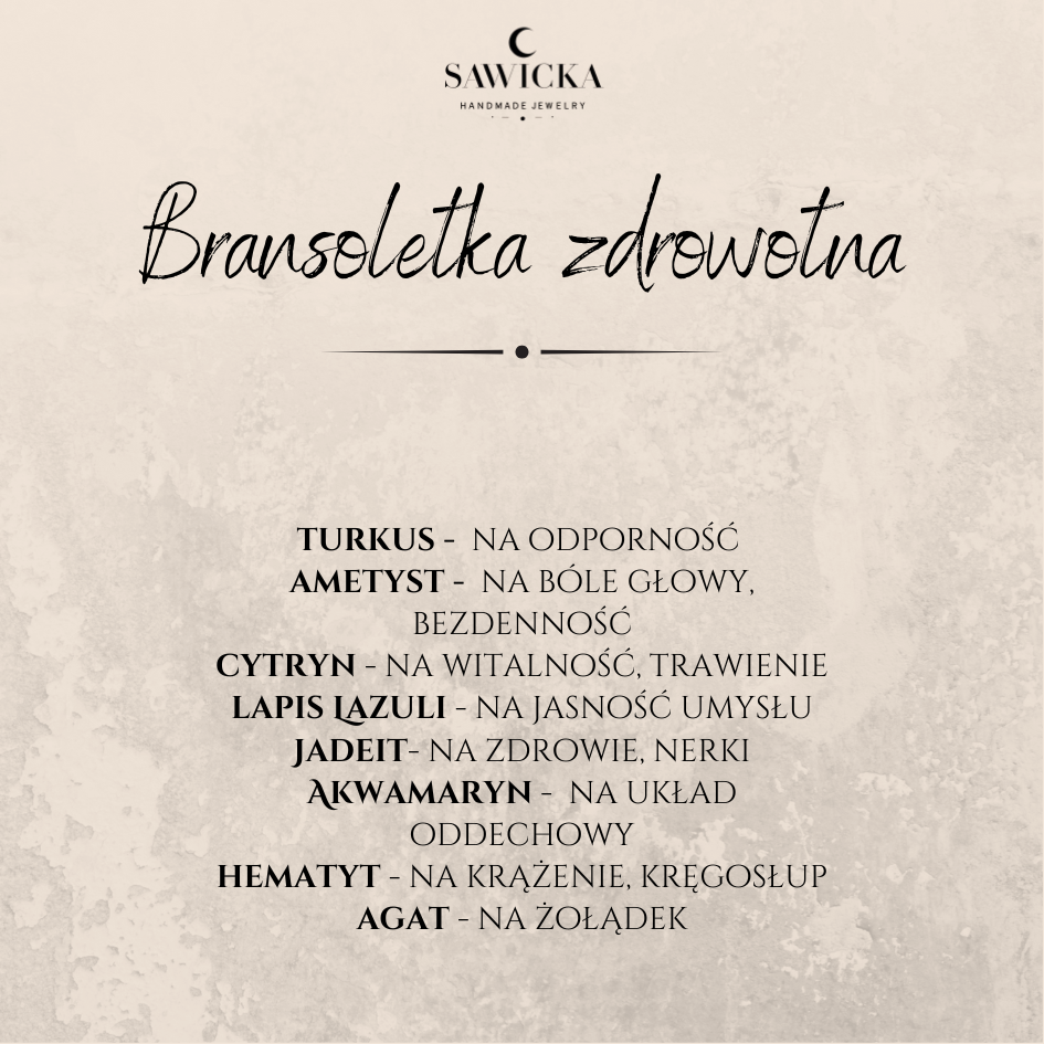Zdjęcia biżuterii są poglądowe, każdy egzemplarz może nieznacznie różnić się między sobą barwą kamieni, ich kształtem czy rozmiarem ze względu na naturalne pochodzenie kamieni. Drobne ubytki czy zarysowania kamieni są dziełem natury i nie stanowią wady produktu.