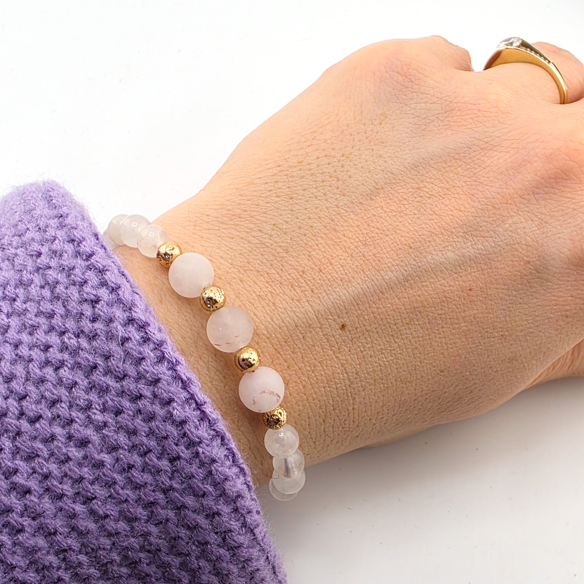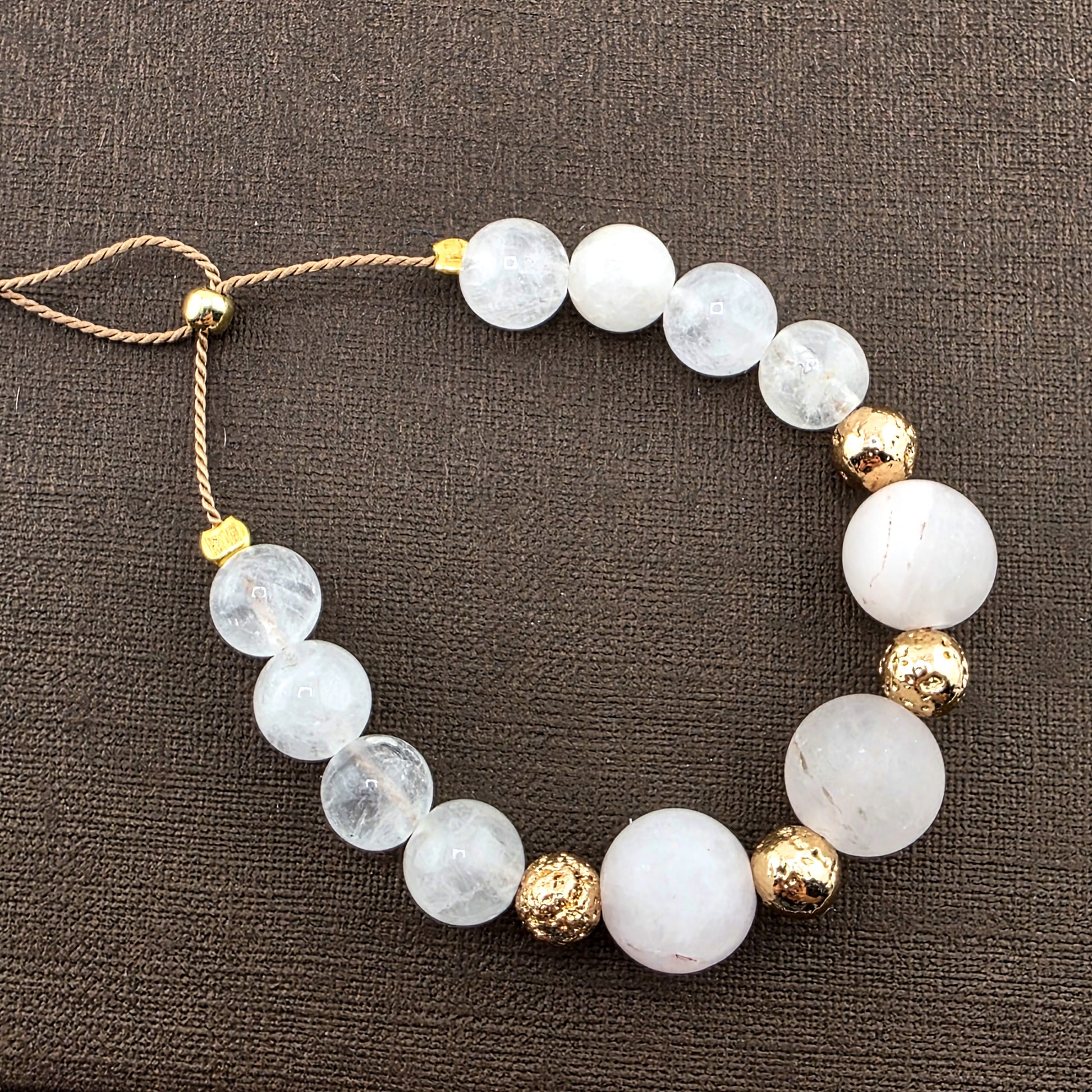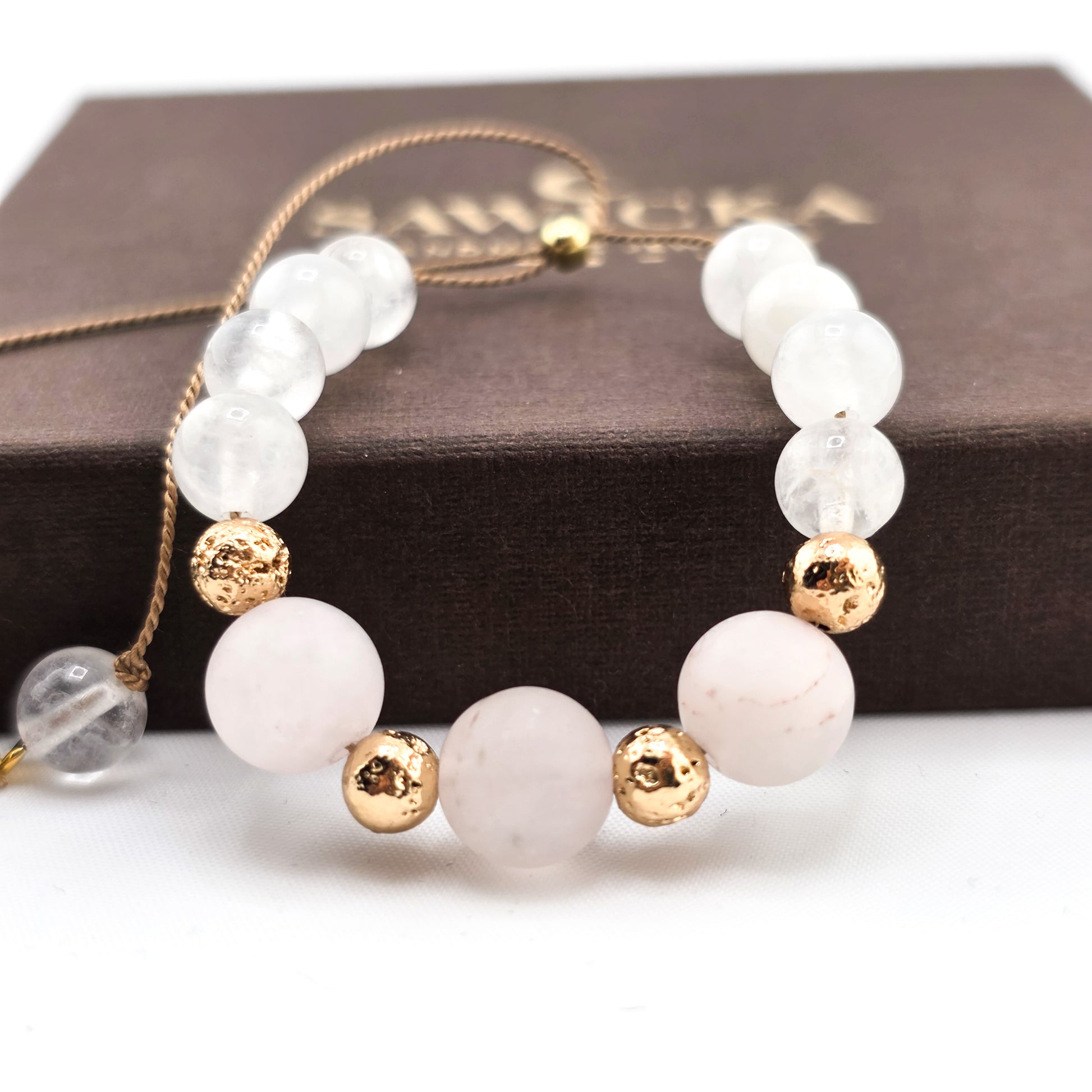 Bransoletka wykonana z kamieni naturalnych, na jedwabnej nici oraz koralików/elementów ze srebra próby 925 pozłacanych 24kt złotem.