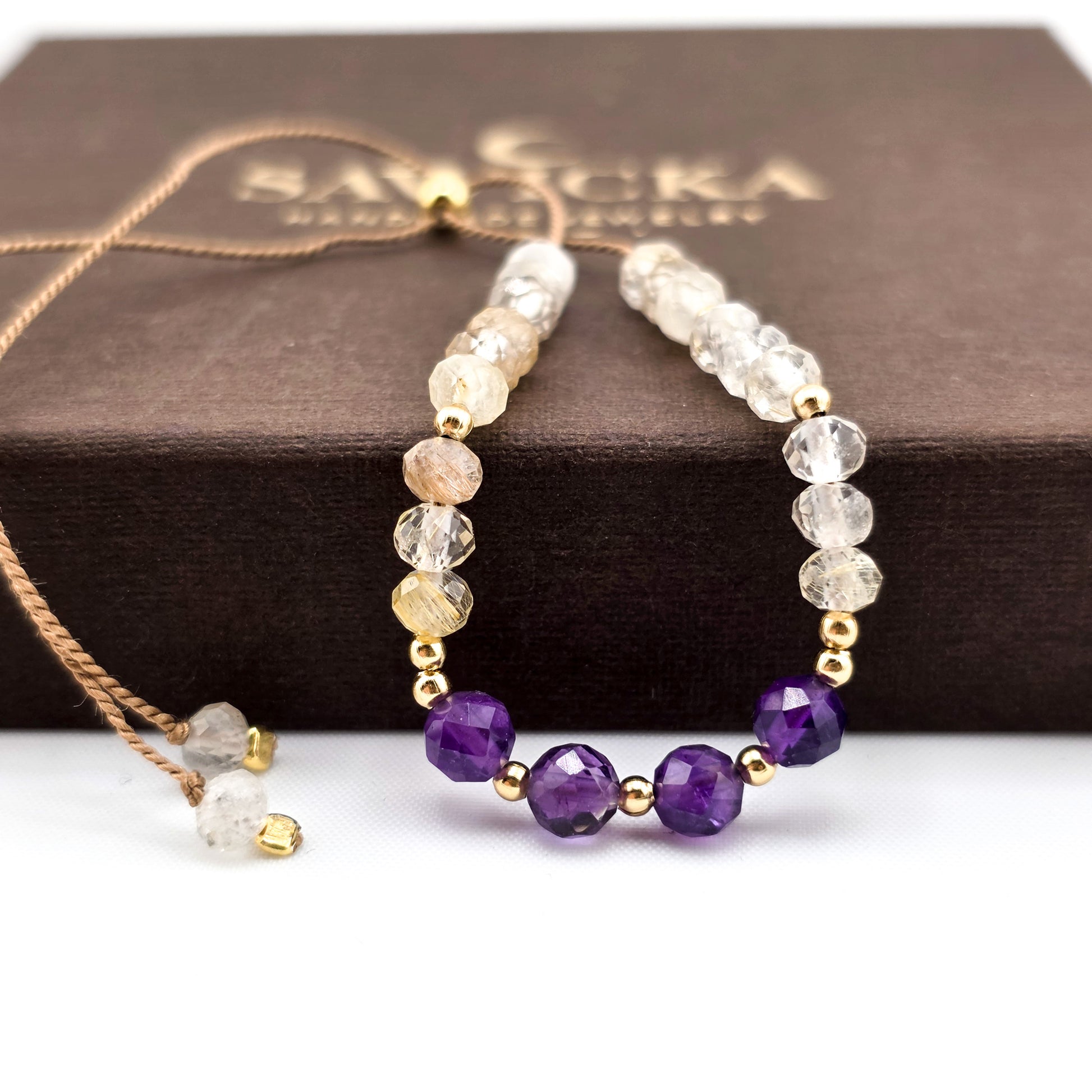 Bransoletka wykonana z kamieni naturalnych, na jedwabnej nici oraz koralików/elementów ze srebra próby 925 pozłacanych 24kt złotem.