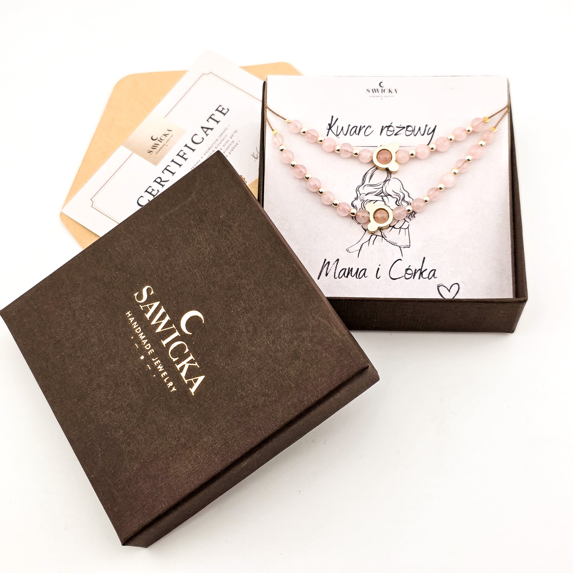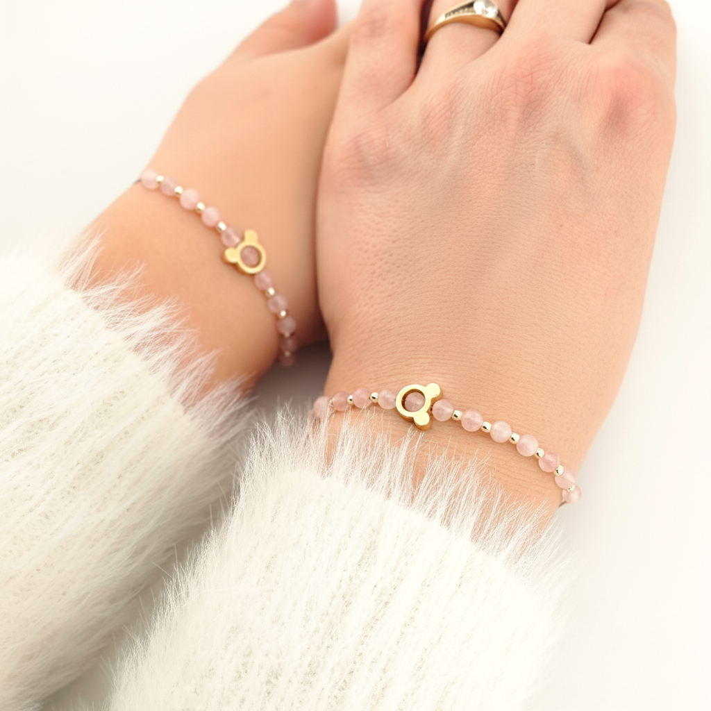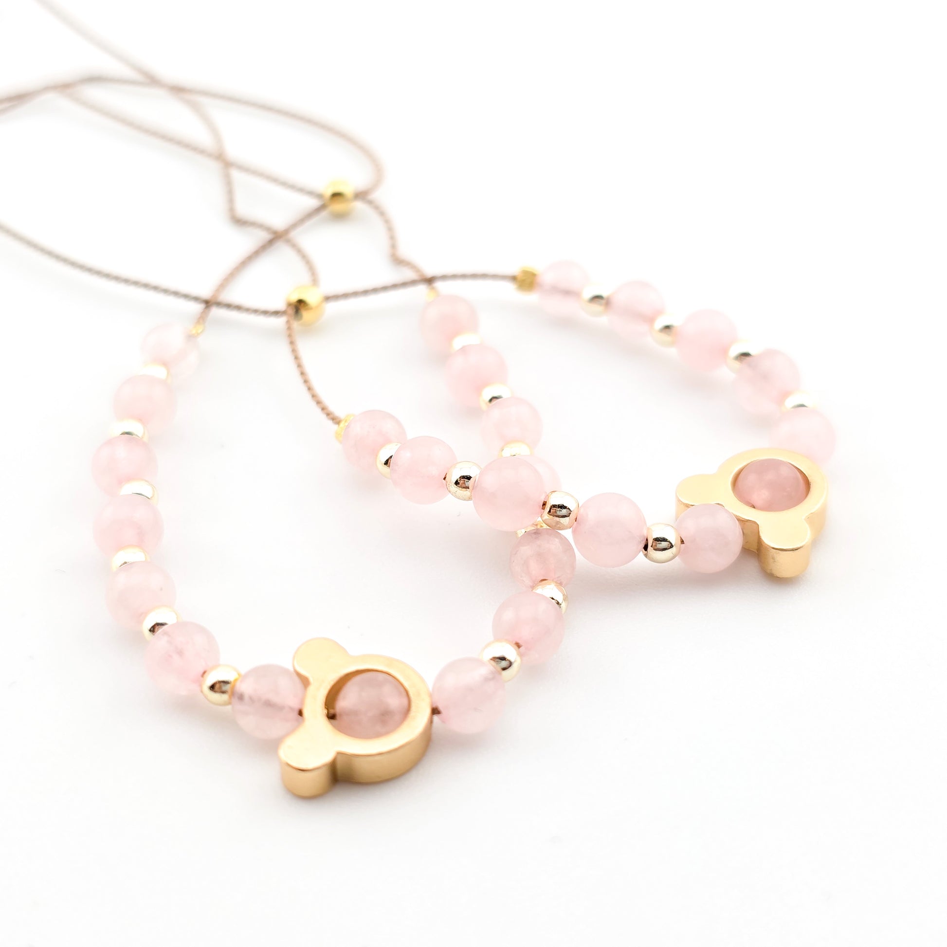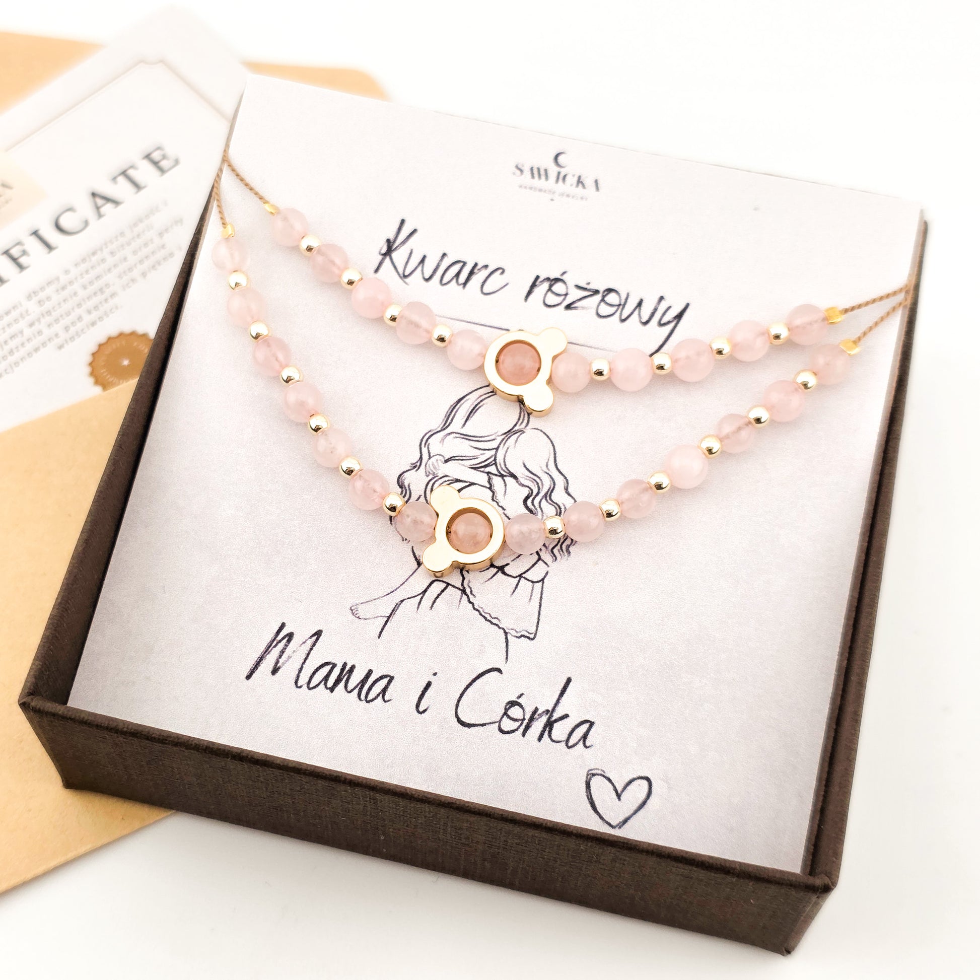 Mama i Córka - bransoletka z misiem / myszką Miki - kwarc różowy - zestaw dla mamy i córki