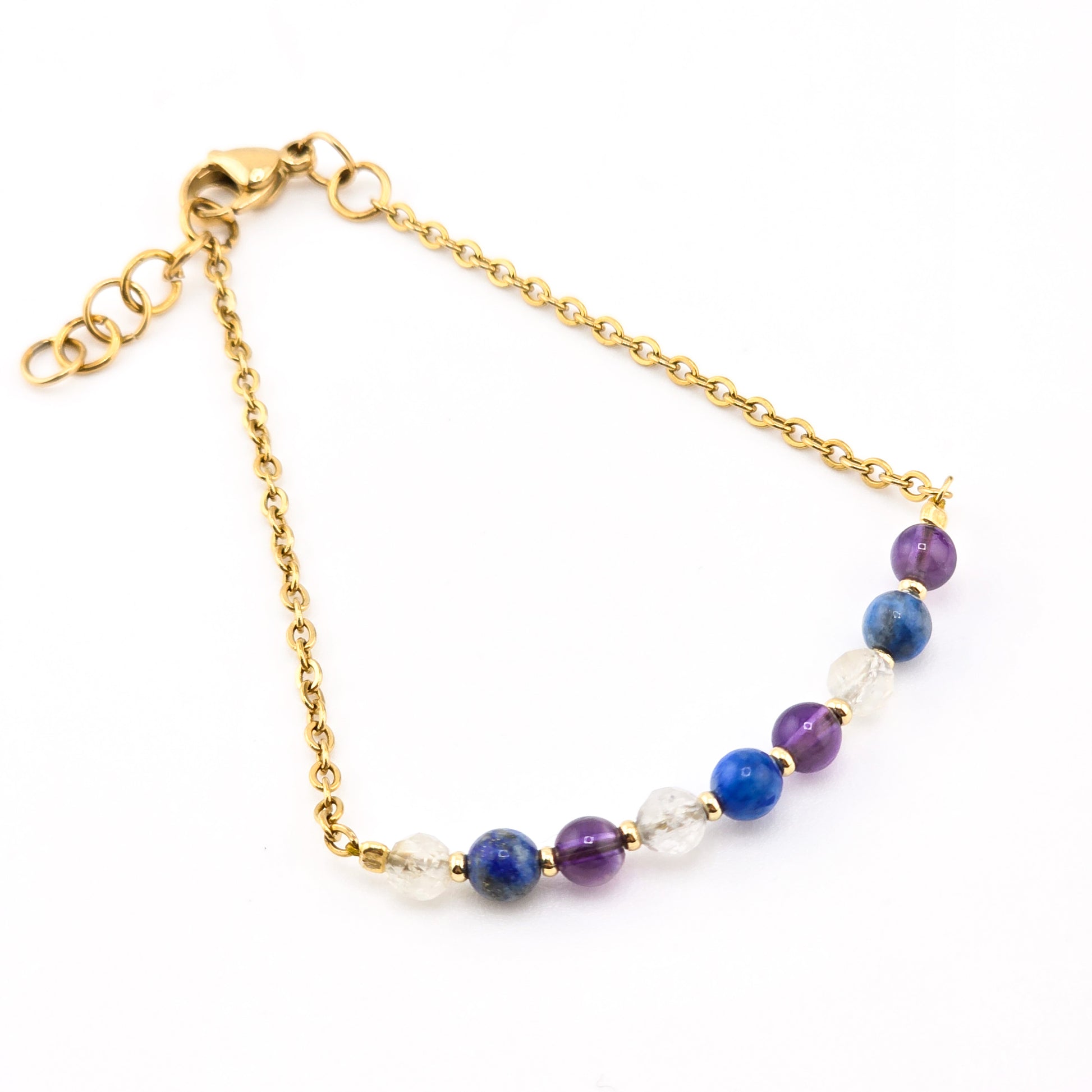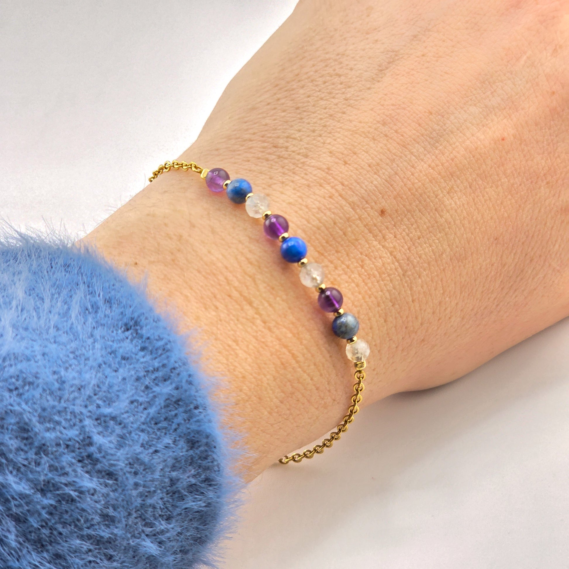 Bransoletka wykonana z kamieni naturalnych, koralików/elementów pozłacanych 24kt złotem oraz stali chirurgicznej pozłacanej (IP)