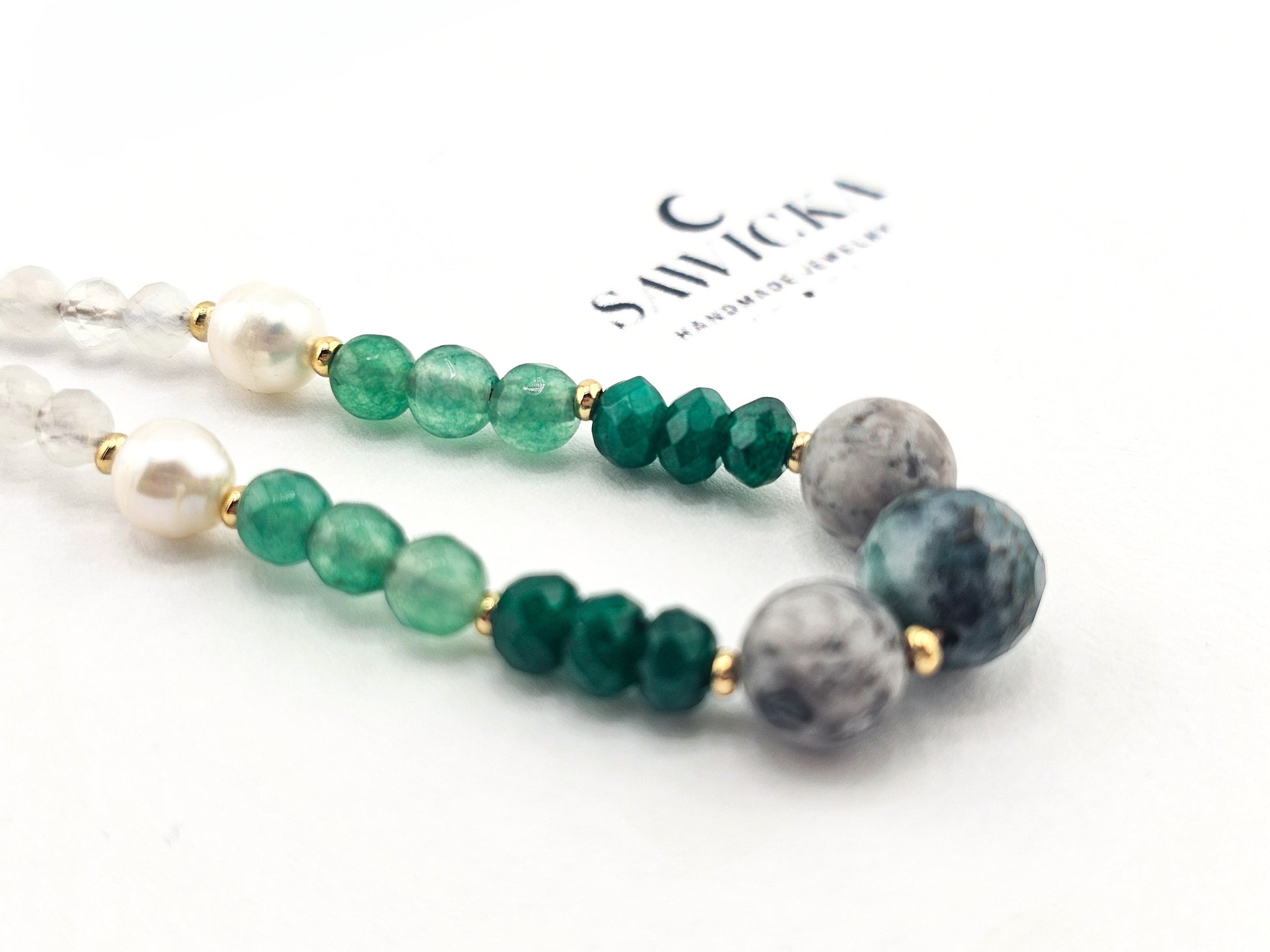 Bransoletka wykonana z kamieni naturalnych, na jedwabnej nici oraz koralików/elementów ze srebra próby 925 pozłacanych 24kt złotem.