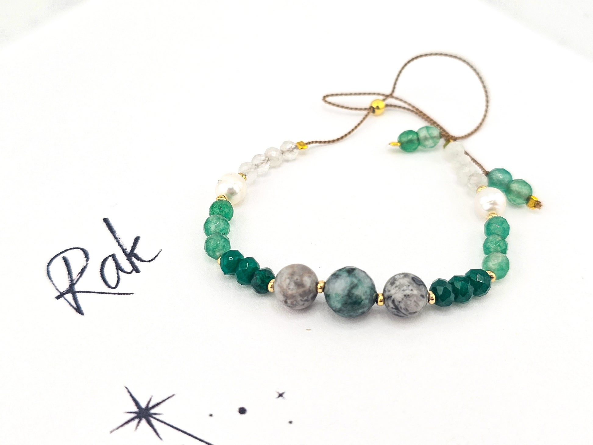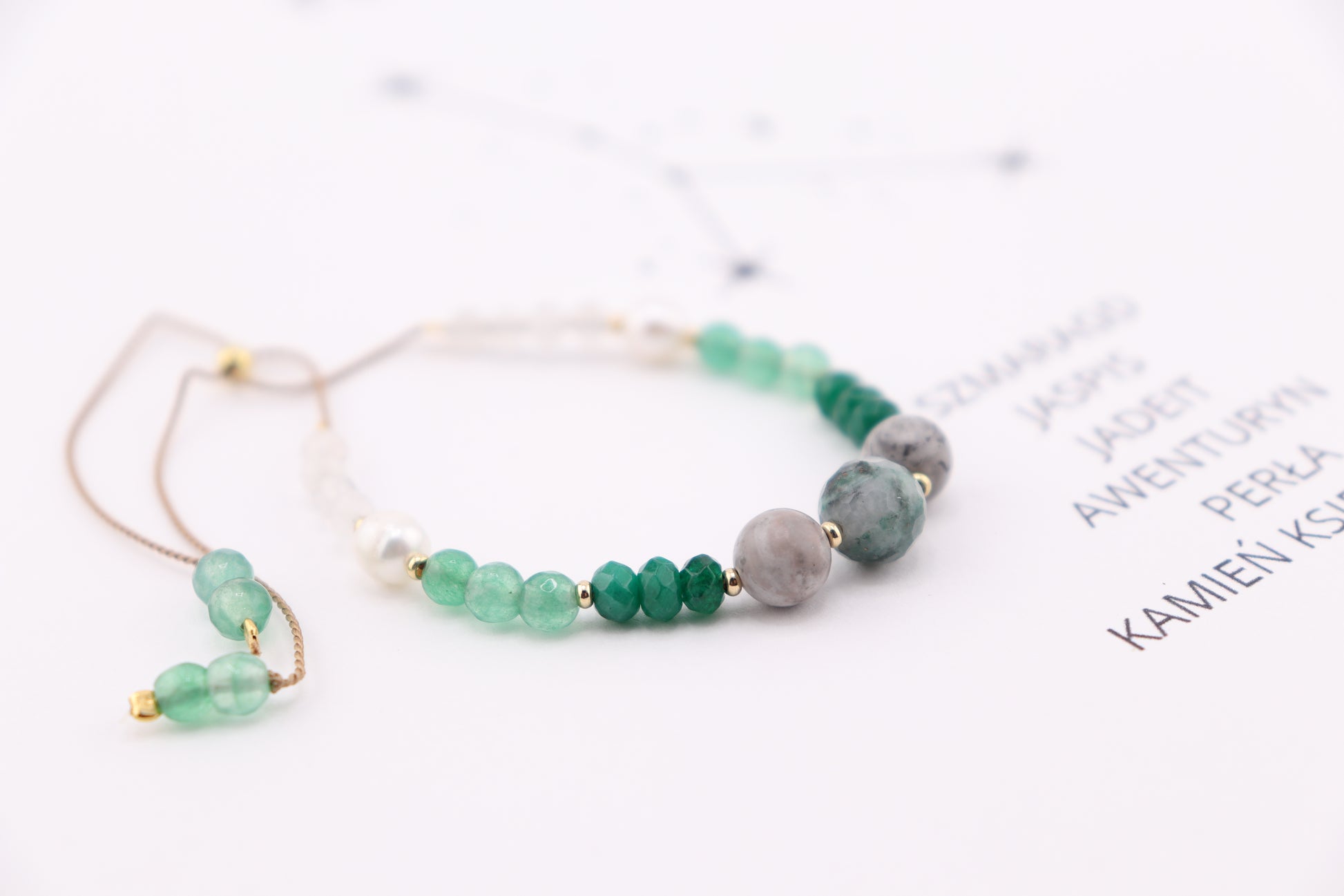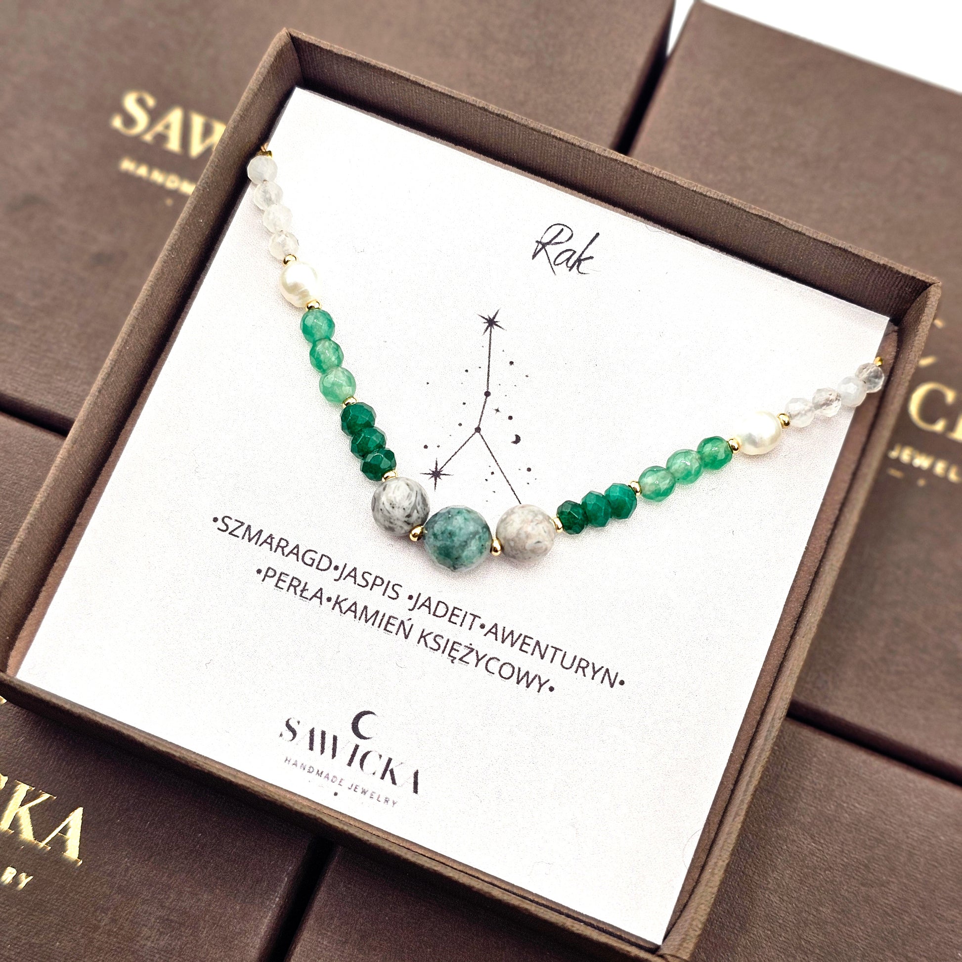 Ta zodiakalna bransoletka dla Raka to delikatne, a zarazem potężne połączenie kamieni, które harmonizują z wrażliwą i opiekuńczą naturą tego wodnego znaku. Zestawienie szmaragdu, jaspisu, jadeitu, awenturynu, perły i kamienia księżycowego tworzy talizman, który wspiera emocjonalną równowagę Raka, wzmacnia intuicję i pomaga mu odnaleźć wewnętrzny spokój oraz poczucie bezpieczeństwa.