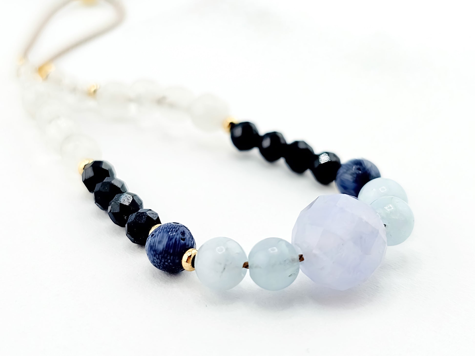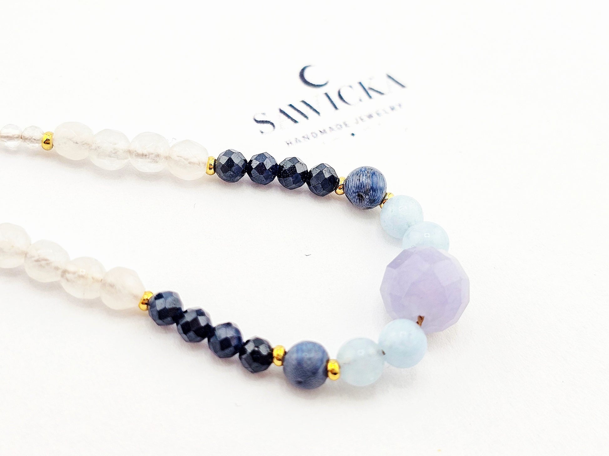 Bransoletka wykonana z kamieni naturalnych, na jedwabnej nici oraz koralików/elementów ze srebra próby 925 pozłacanych 24kt złotem.
