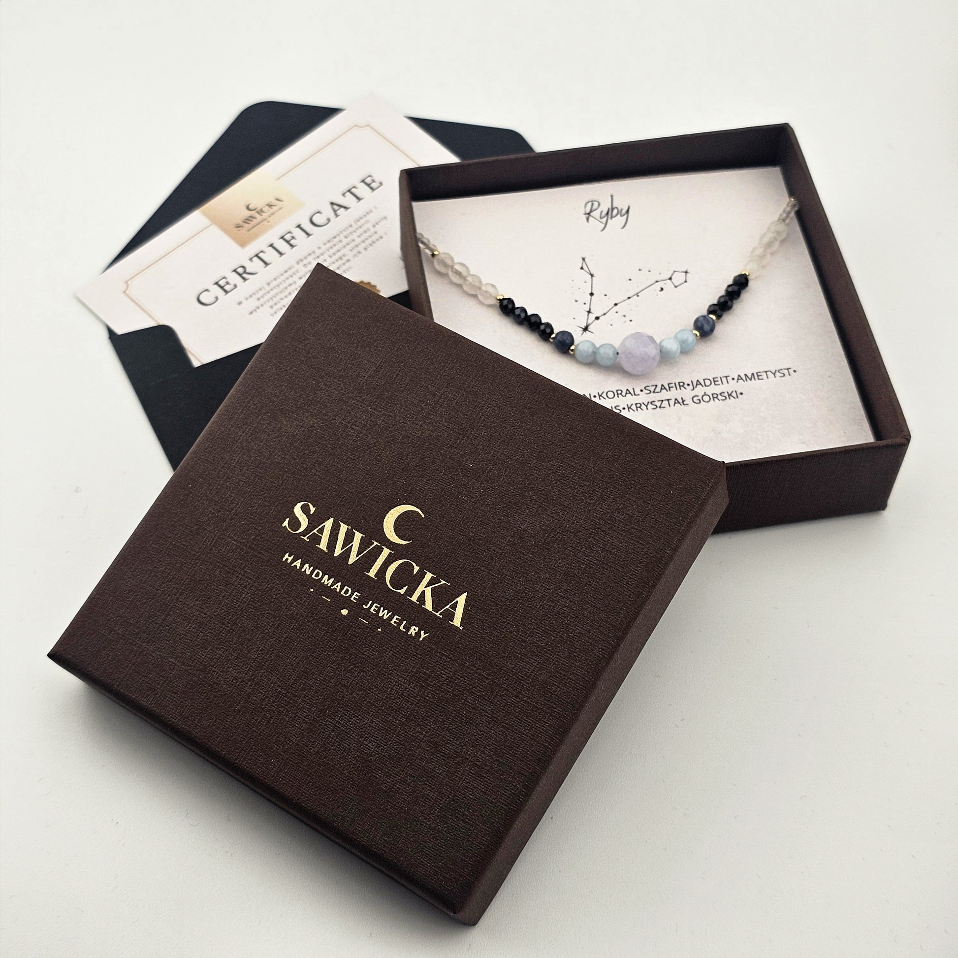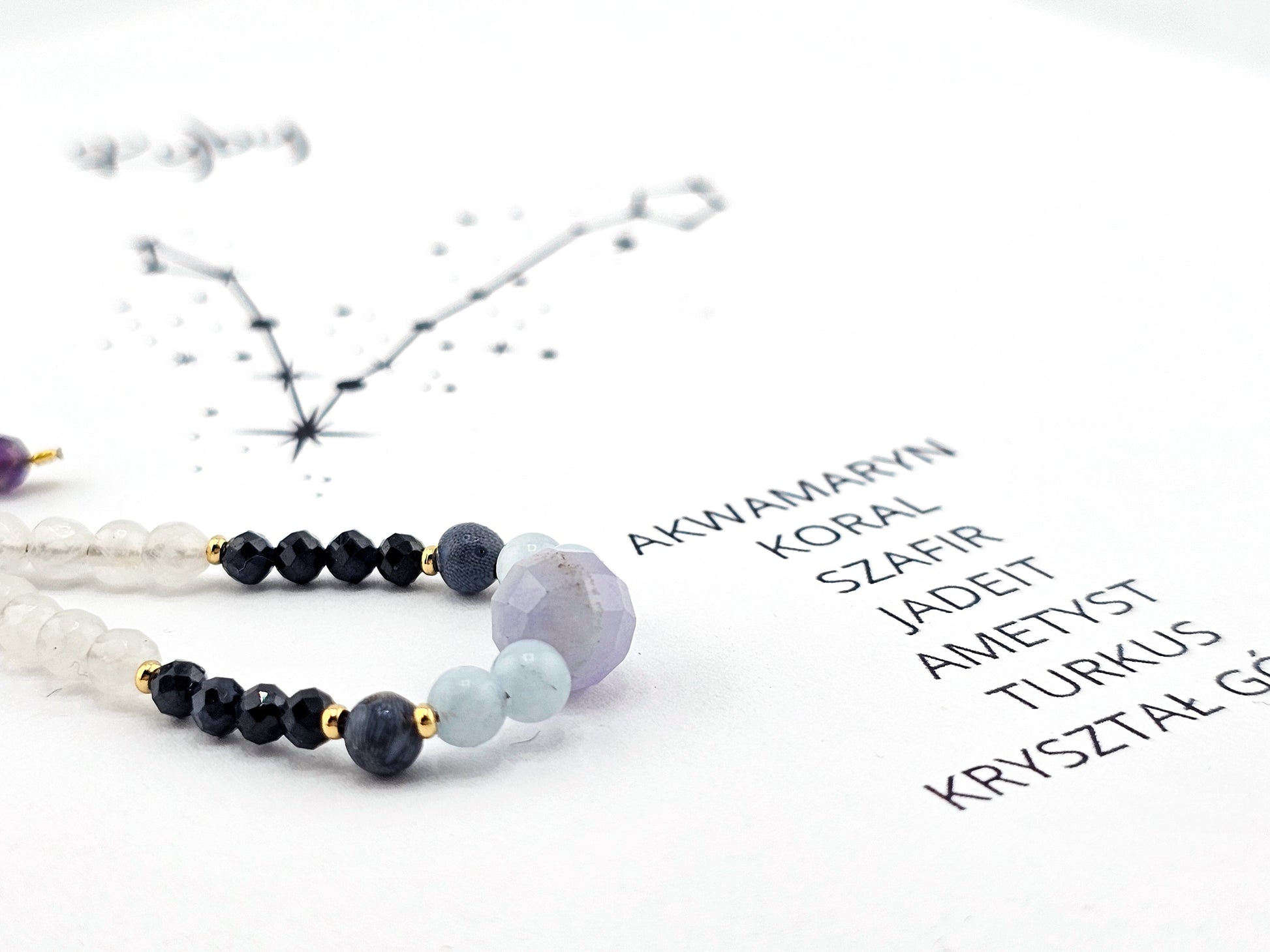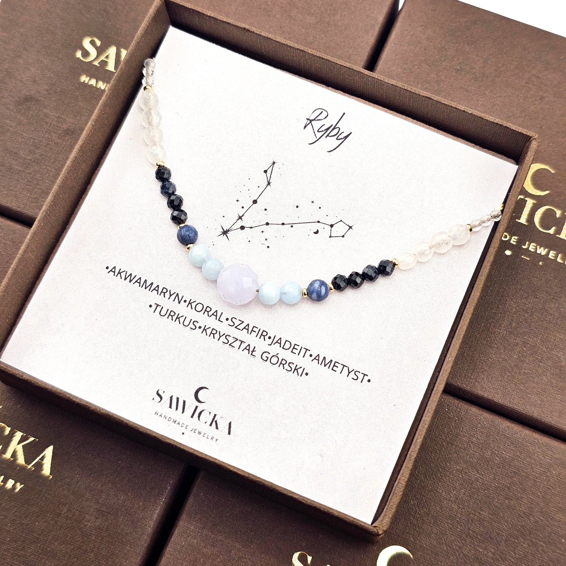 Ta zodiakalna bransoletka dla Ryby to magiczne połączenie kamieni, które harmonizują z głęboką, intuicyjną i uduchowioną naturą tego wodnego znaku. Zestawienie akwamarynu, koralu, szafiru, jadeitu, ametystu, turkusu i kryształu górskiego tworzy potężny talizman, który wspiera Rybę w jej podróży przez życie, pomagając odnaleźć równowagę między marzeniami a rzeczywistością, jednocześnie chroniąc jej wrażliwą duszę.