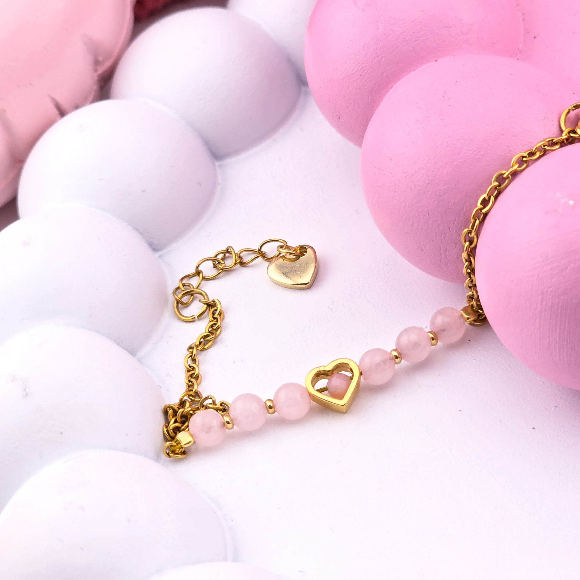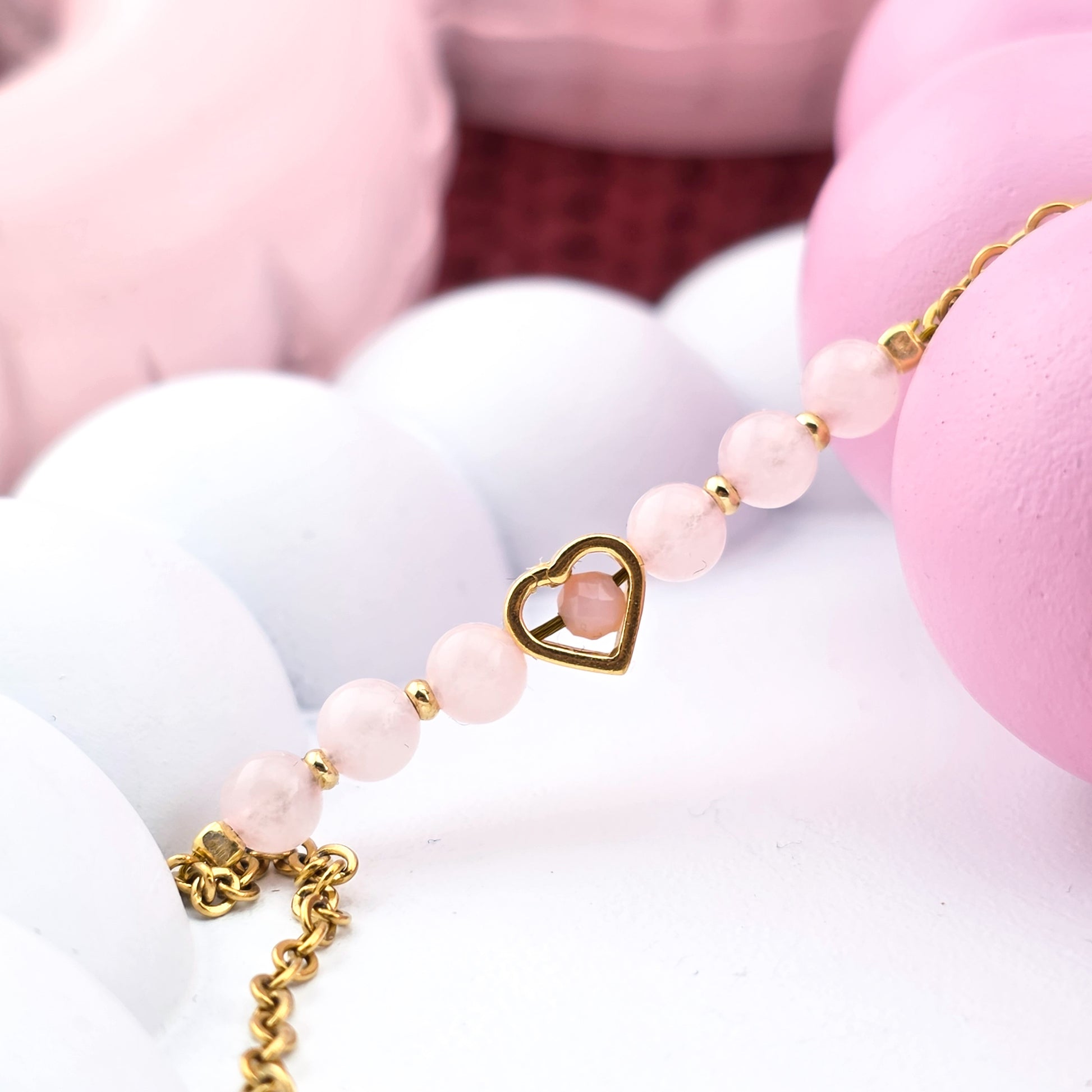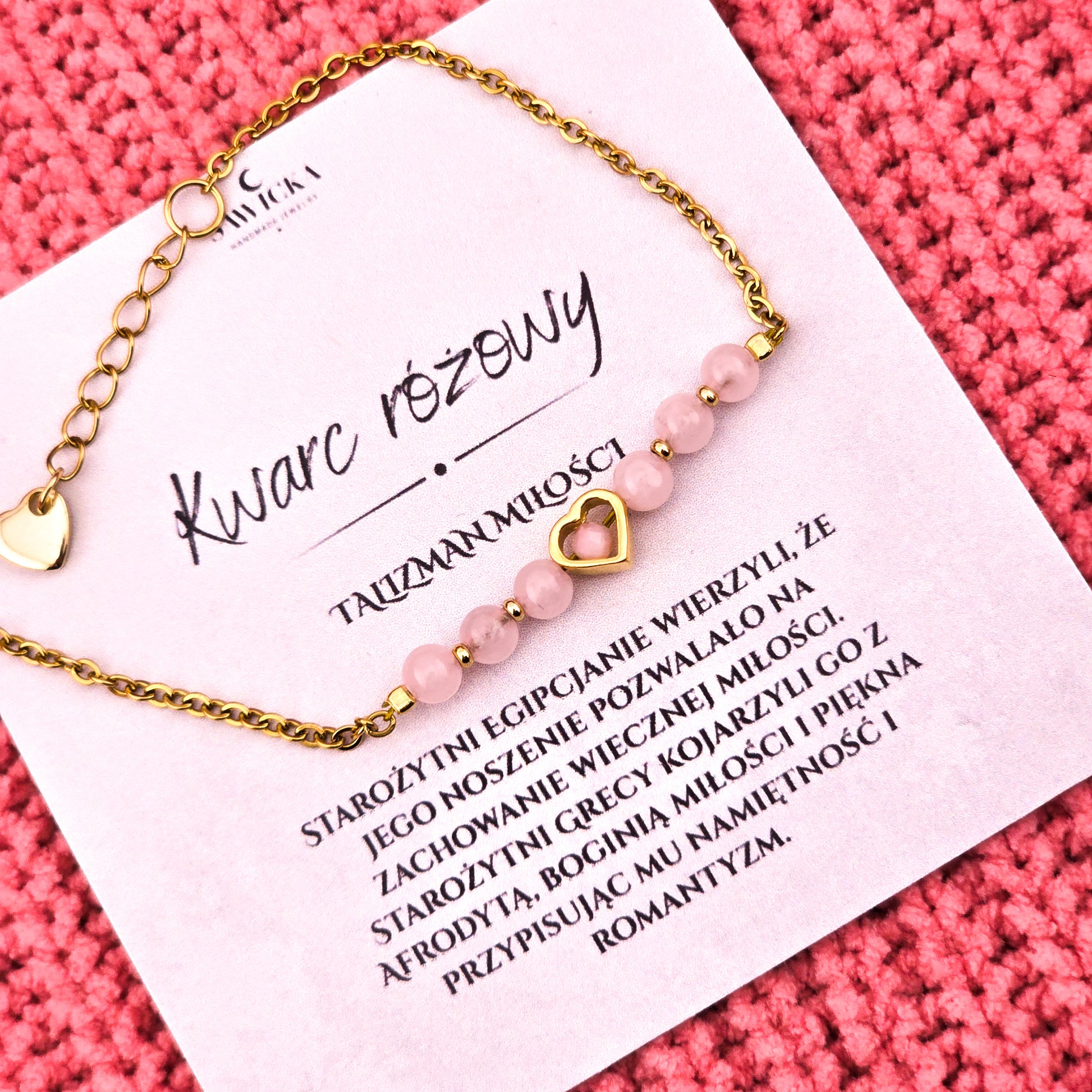 TALIZMAN MIŁOŚCI - bransoletka z kwarcem różowym i sercem - na łańcuszku