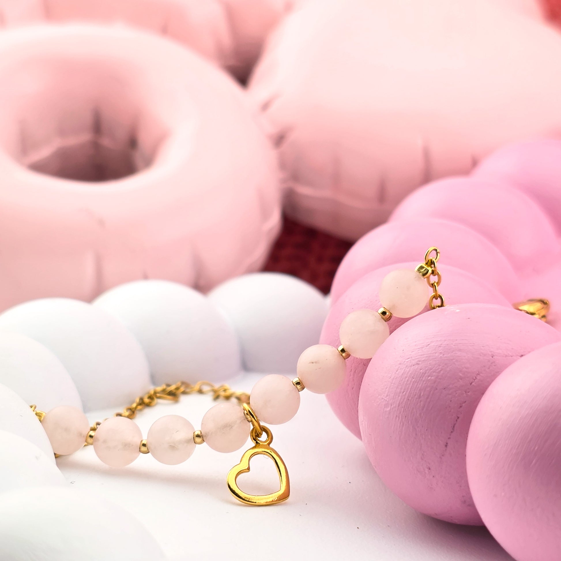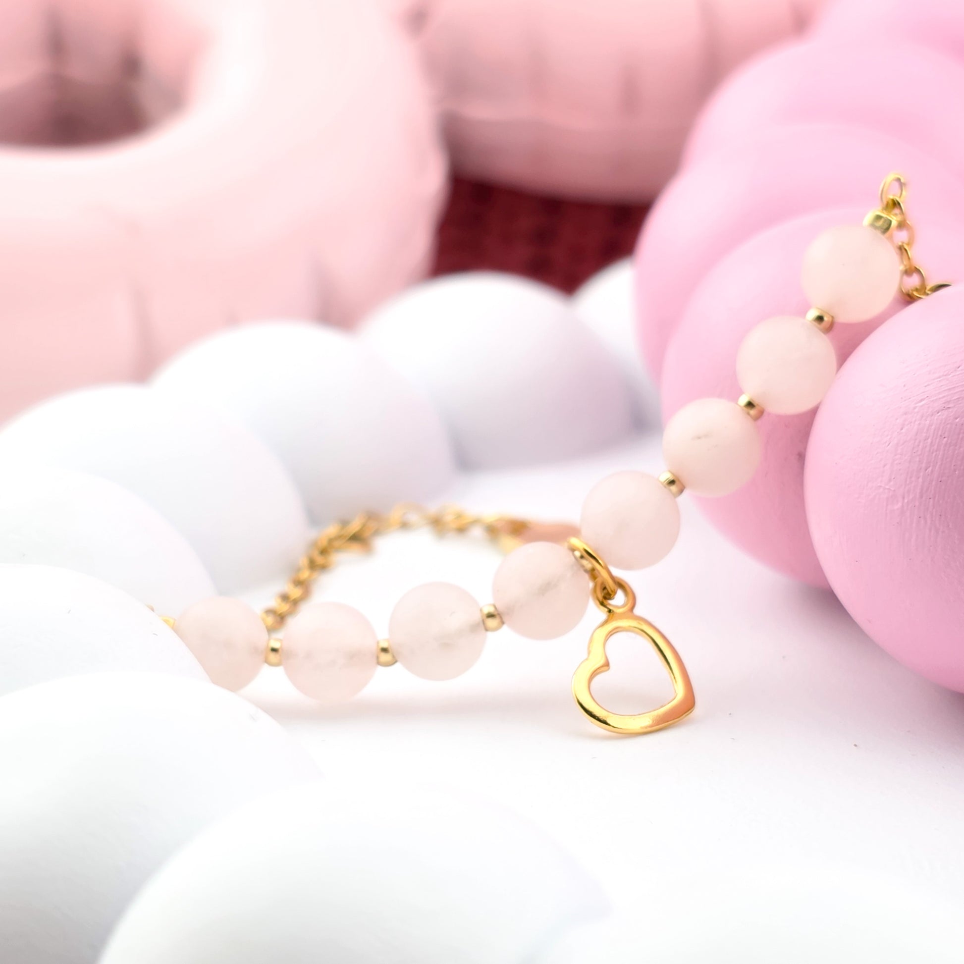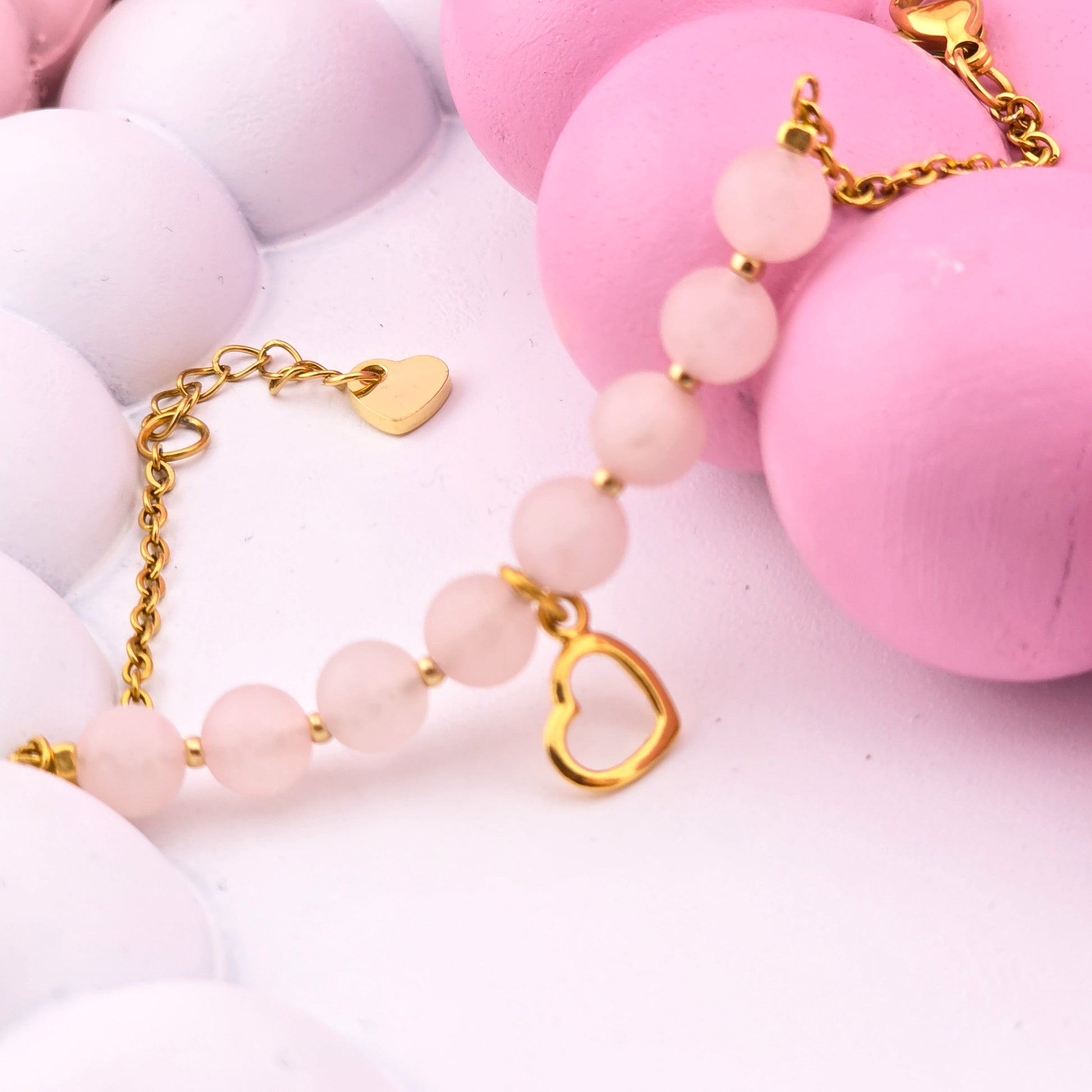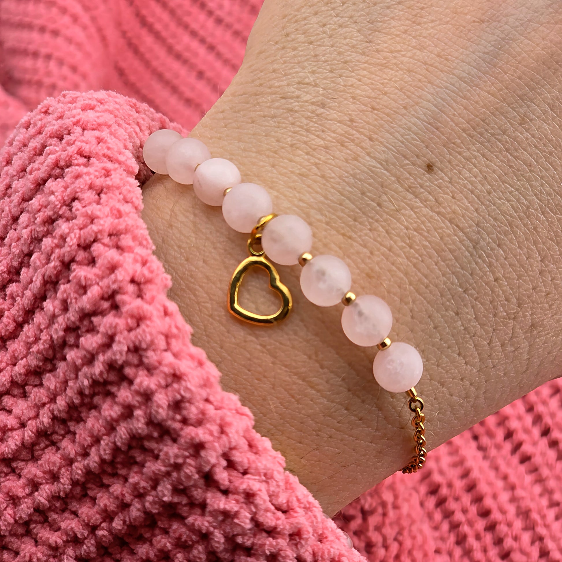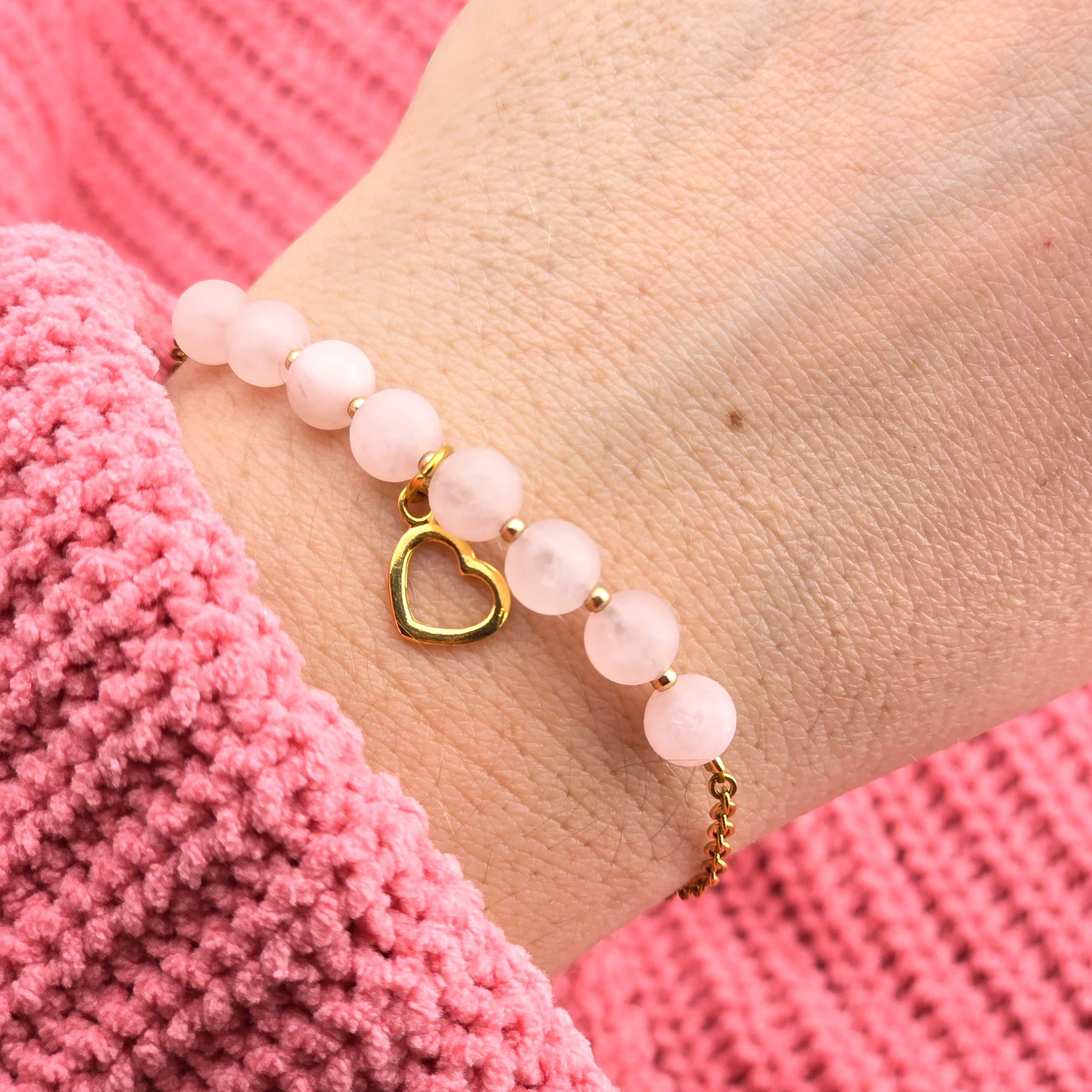 TALIZMAN MIŁOŚCI - bransoletka z kwarcem różowym i zawieszką serce - na łańcuszku