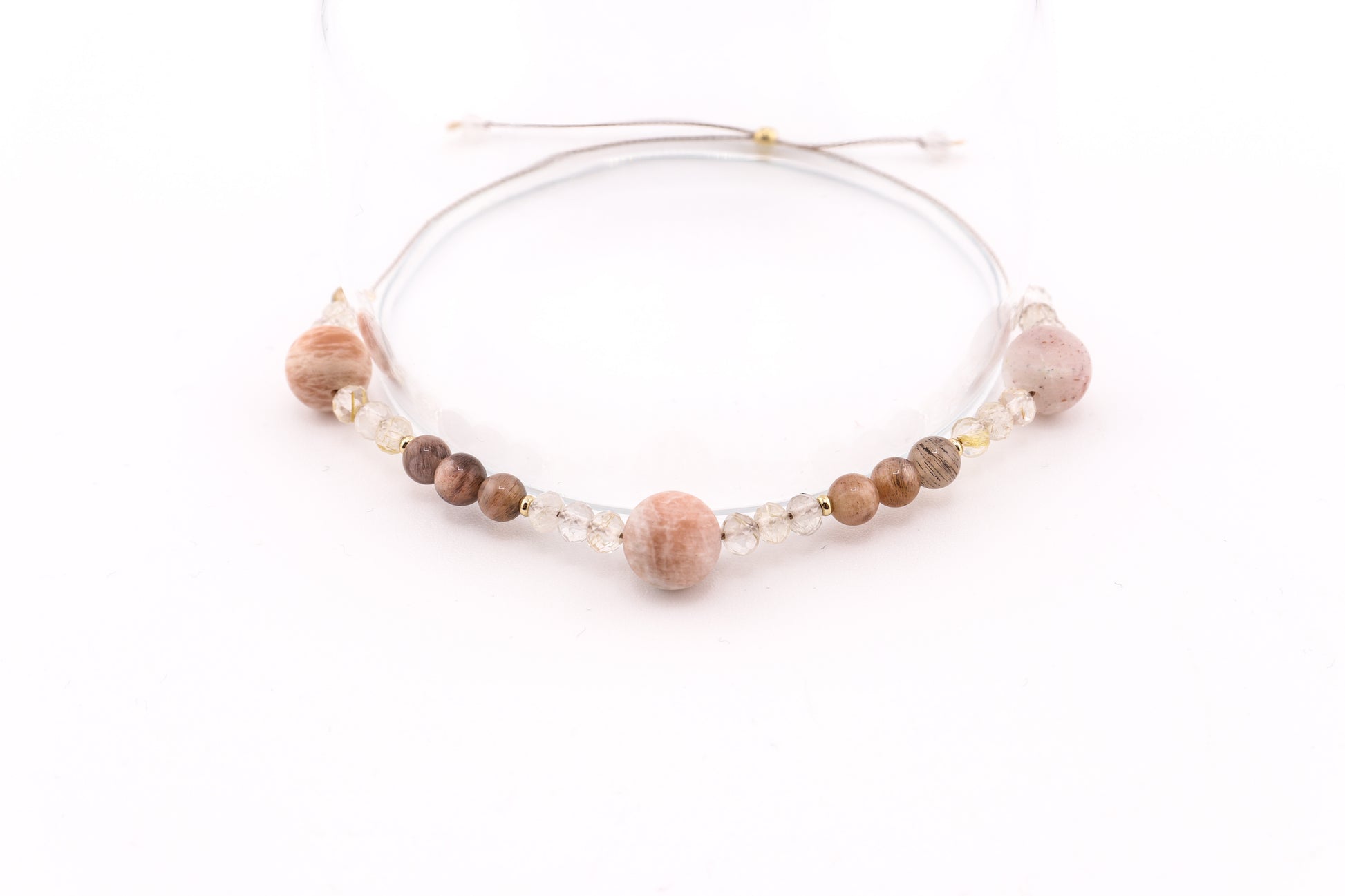 Bransoletka wykonana z kamieni naturalnych, na jedwabnej nici oraz koralików/elementów ze srebra próby 925 pozłacanych 24kt złotem.